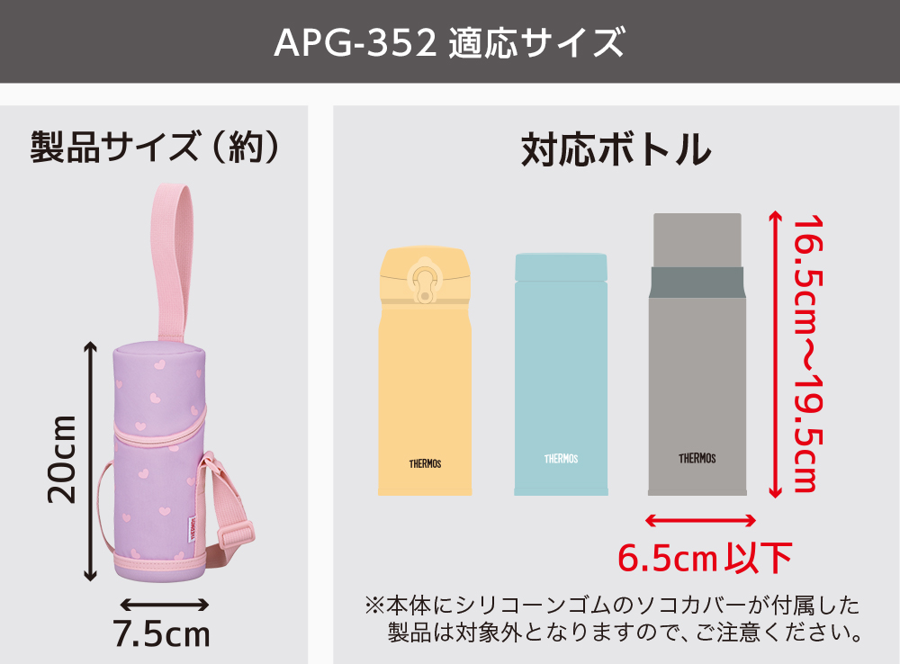 高さ16.5cm~19.5cm、幅6.5cm以下のサーモス製真空断熱ボトルに対応。