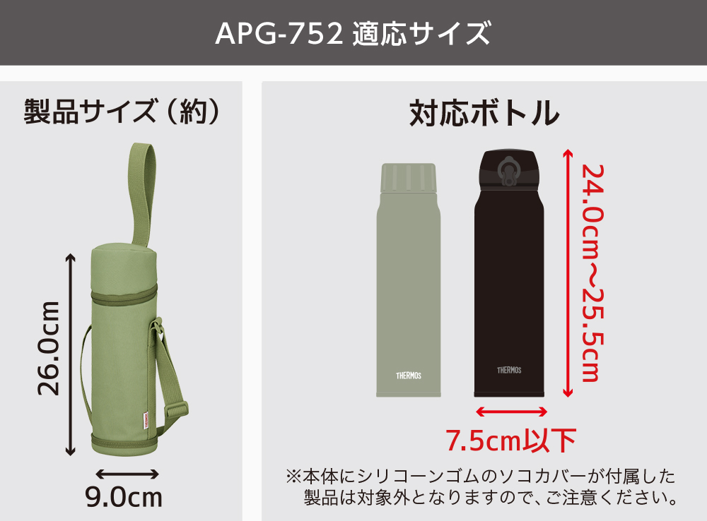 高さ24.0cm~25.5cm、幅7.5cm以下のサーモス製真空断熱ボトルに対応。