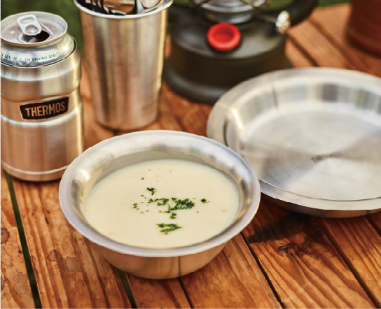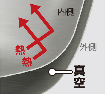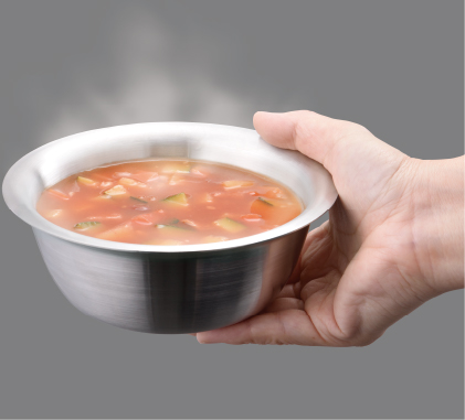 真空断熱構造だから熱いスープやカレーを入れても外側が熱くならない。