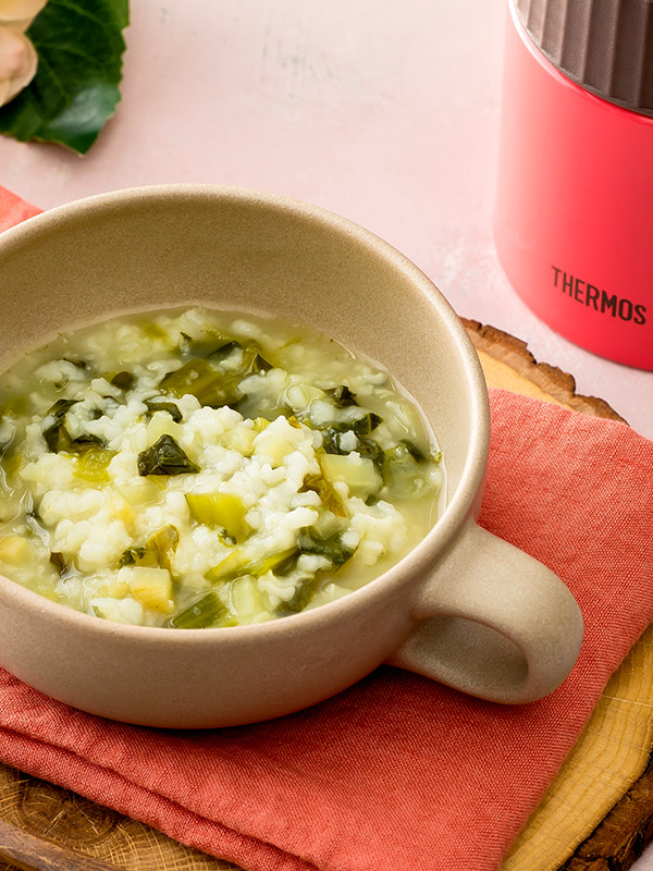 こんぶ茶の旨味と漬物の塩味で程よく味がついたおかゆ。小松菜のミネラルをしっかりとれて、胃にやさしいので、ダイエット中の方、胃もたれ、胃疲れしている方などにもおすすめです。