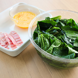 1. ほうれん草は4cm長さに切り、水に10分晒して水気を切る。ベーコンは1.5cm幅に切る。卵は溶きほぐしてマヨネーズを混ぜる。