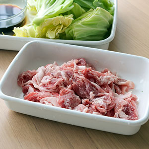 - 豚肉に薄力粉をまぶす。キャベツはざく切りにする。●は合わせておく。