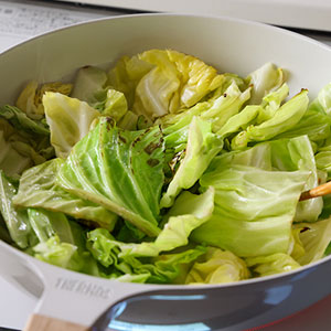 - フライパンに油小さじ2を中火で熱してキャベツを炒め、塩・こしょうを振る。しんなりしたら器に盛り付ける。