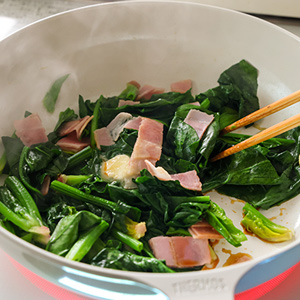 3. そのままのフライパンを中火で熱してほうれん草とベーコンを炒め、火が通ったら●を加えてさっとからめる。