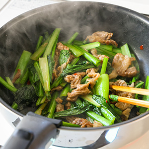 - フライパンにごま油と豆板醬を入れて中火で熱し、豚肉を炒める。色が変わったら小松菜も加えてしんなりするまで炒める。